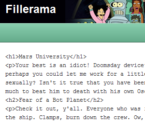 When you go to the Fillerama page, you are immediately prompted with copy-able filler text from the popular television show Futureama. It offers both HTML and normal versions of the text to copy. If you don’t like the initial version, though, you can change the settings for number of paragraphs, lists, headers, or even choose from a different show (Doctor Who, Dexter, Monty Python, The Simpsons, and Star Wars).